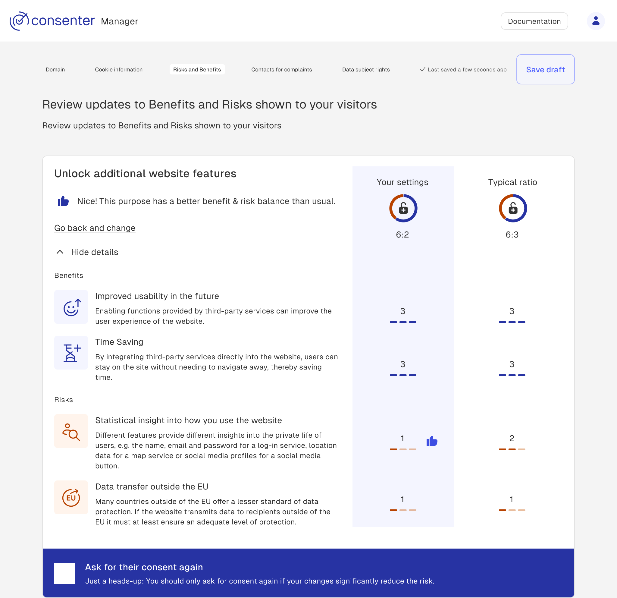We will communicate the changes to the risk-benefit ratios to your user the next time they visit your website. Depending on whether they are a Consent Agent user or not, we can display the change to them accordingly.