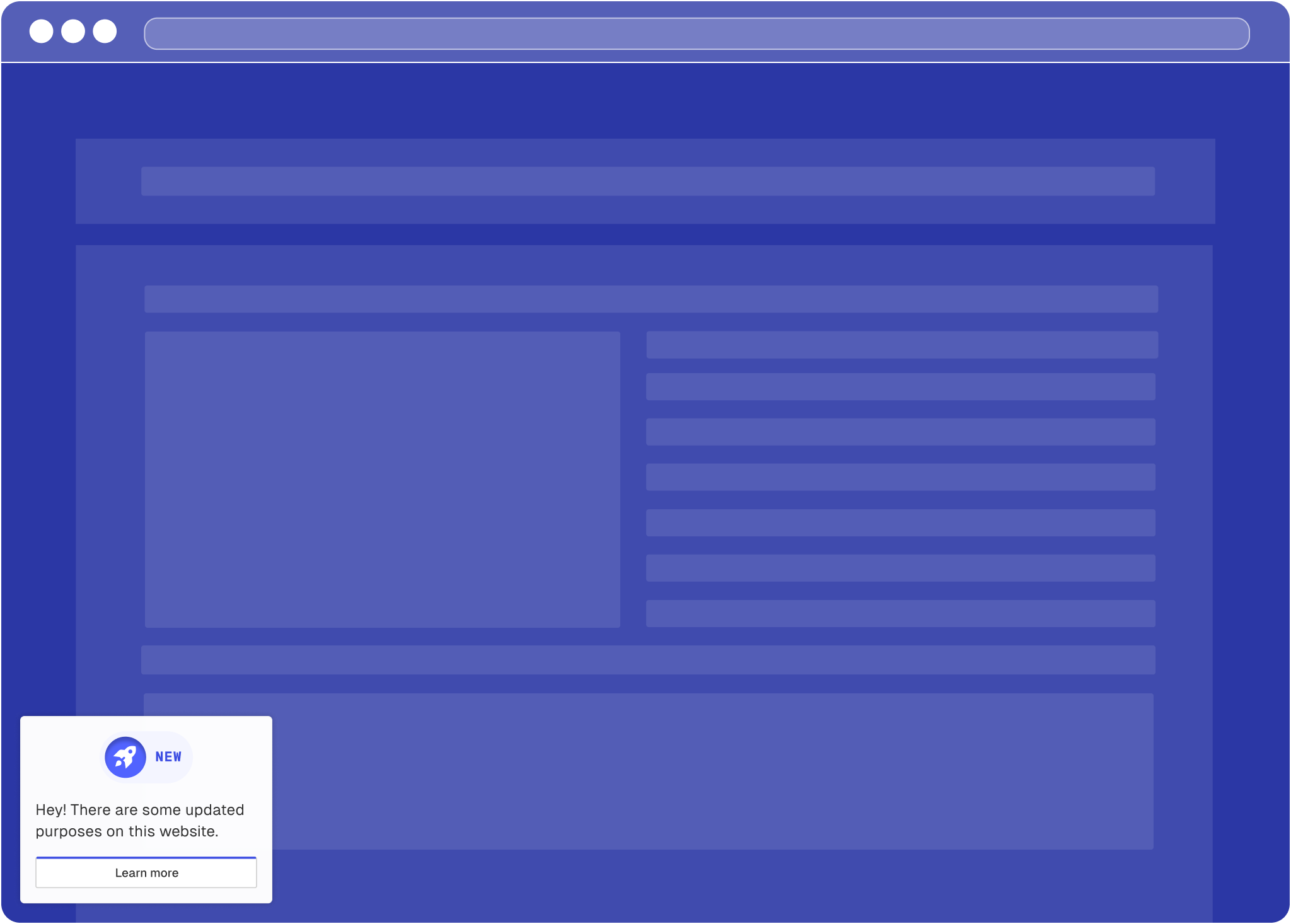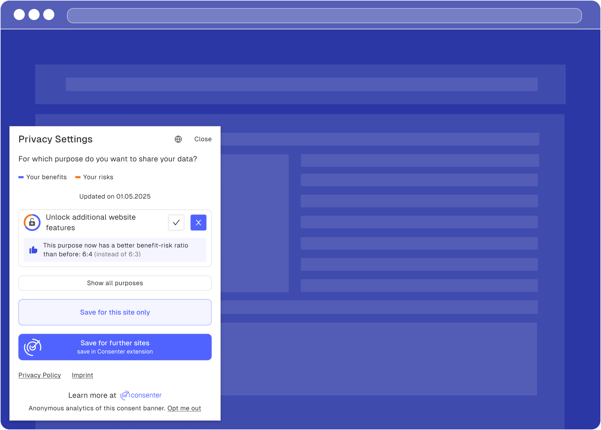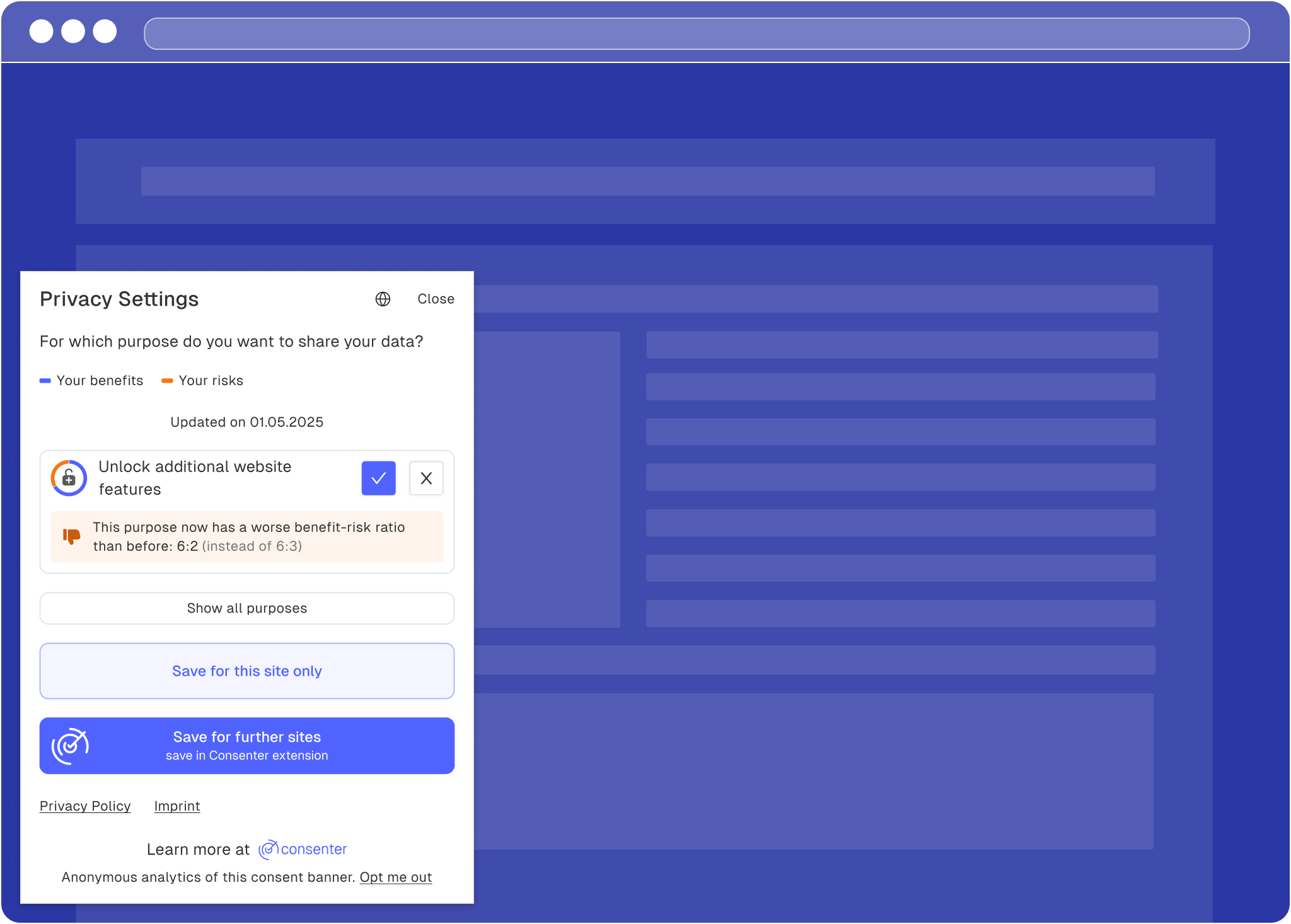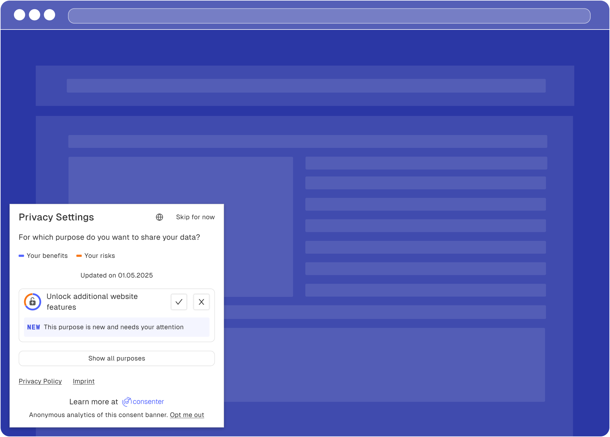 Since your user's last visit, you have selected an additional data processing purpose in Consenter Manager and would like to ask your users for their consent for this new purpose.